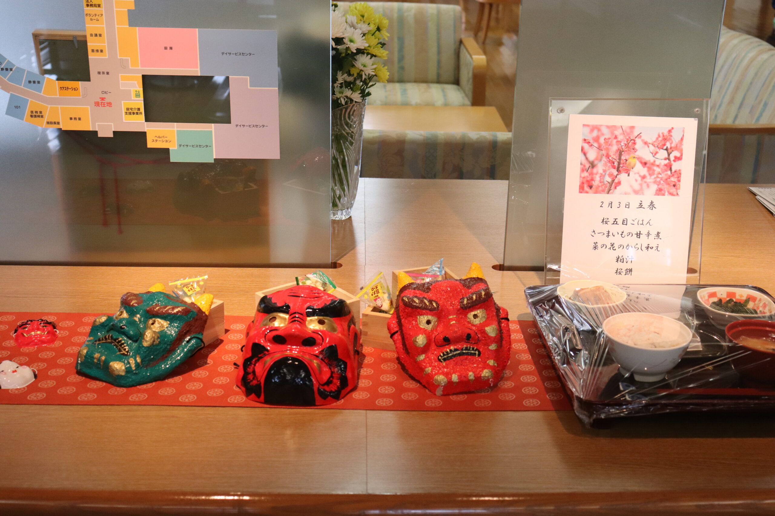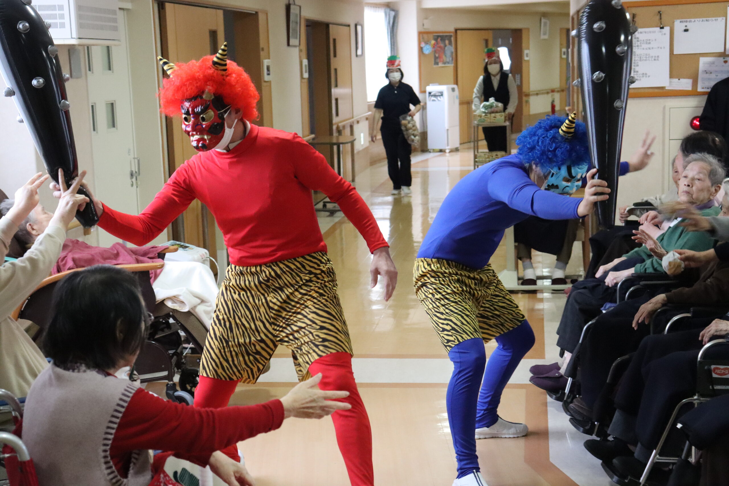 2月3日、施設では恒例の豆まきを行いました。若い男子職員が青鬼と赤鬼に扮し施設内に現れると、入所者の皆さんから歓声ともどよめきともつかない声が漏れ、その後は職員と一緒に勢いよく豆を投げつけて皆さん見事に鬼を追い払いました。コミカルな身振りで退散していく二人の鬼の熱演に、職員からはねぎらいの拍手が送られました。