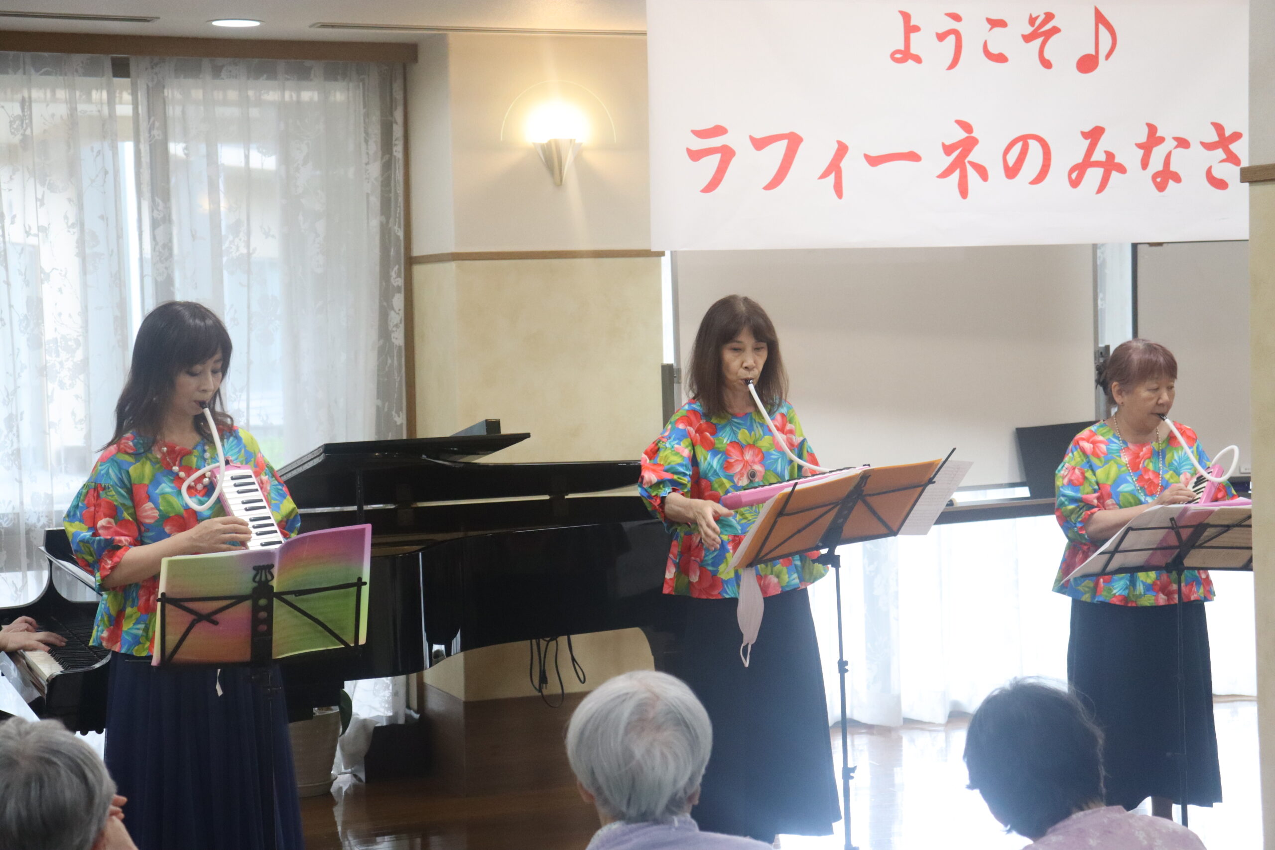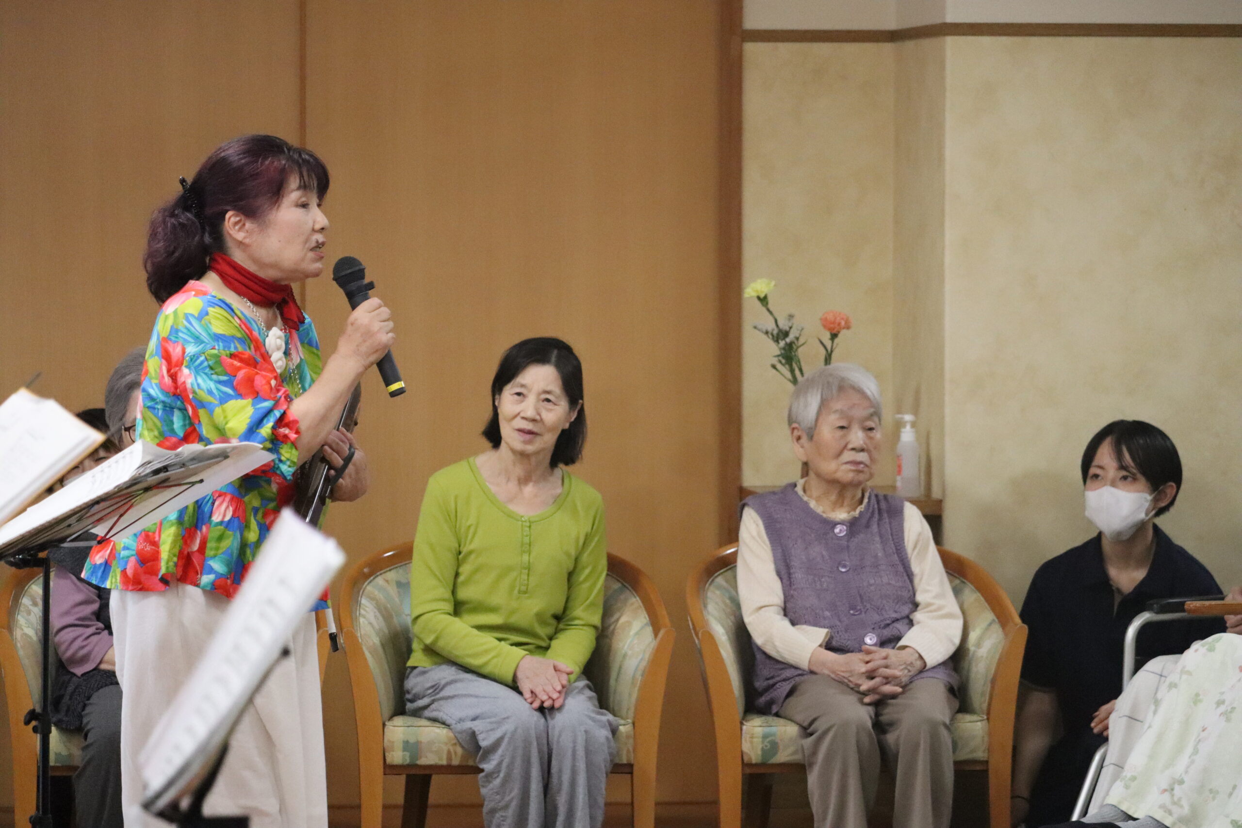 いらした皆さんは夏らしい衣装に身を包み、器楽演奏や「ふるさと」「青い山脈」といった懐かしい唱歌まで盛りだくさんの演目で入所者さんを楽しませてくれました。