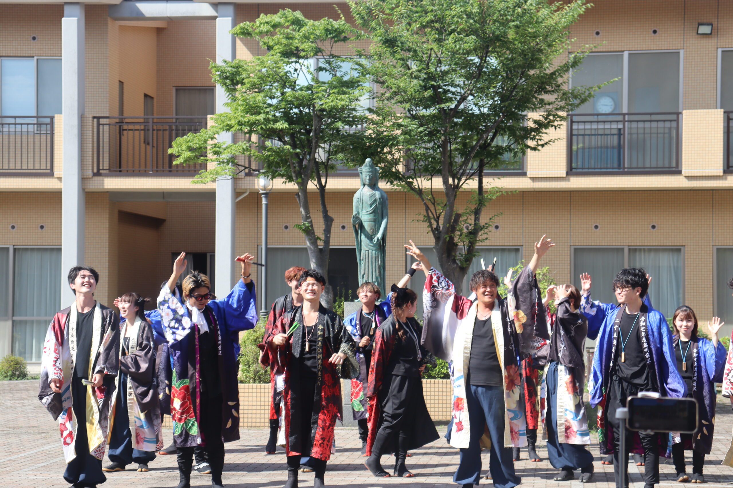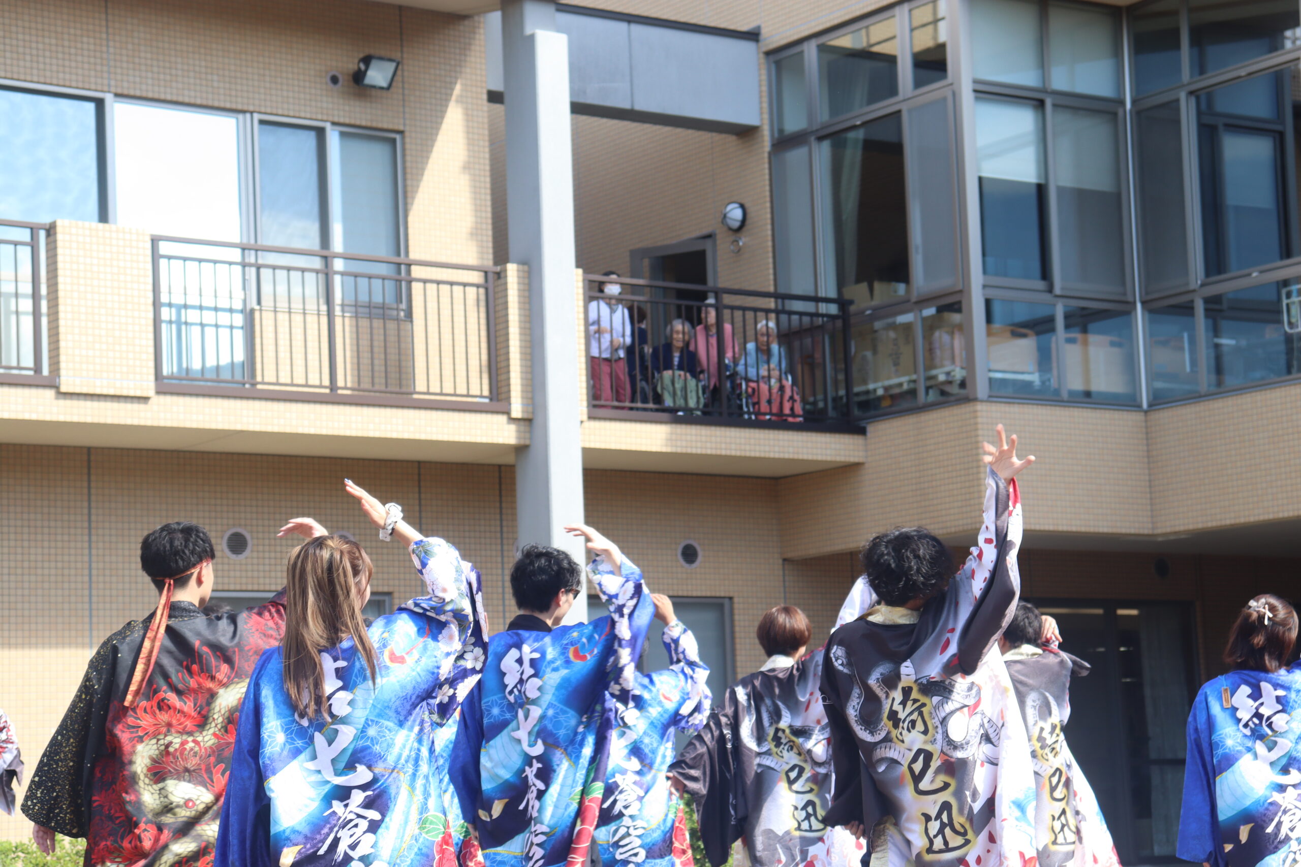 8月9日、今年の25歳厄年連である、水沢の「綺巳迅(あやしじん)」、江刺の「緋煌爛(ひこうらん)」、前沢の「結七蒼穹會(ゆいなそうきゅうかい)」)の皆さん32名が夏まつりのゲストに来荘しました。例年お祭りを盛り上げてくれる厄年連の踊りですが、今年は酷暑の暑気を吹き飛ばさんとばかりに、とりわけ気持ちのこもった勢いのある舞を披露してくださいました。入所者さんと職員は、中庭に響き渡るかけ声に合わせて手拍子をしながら、約30分のステージに見入りました。