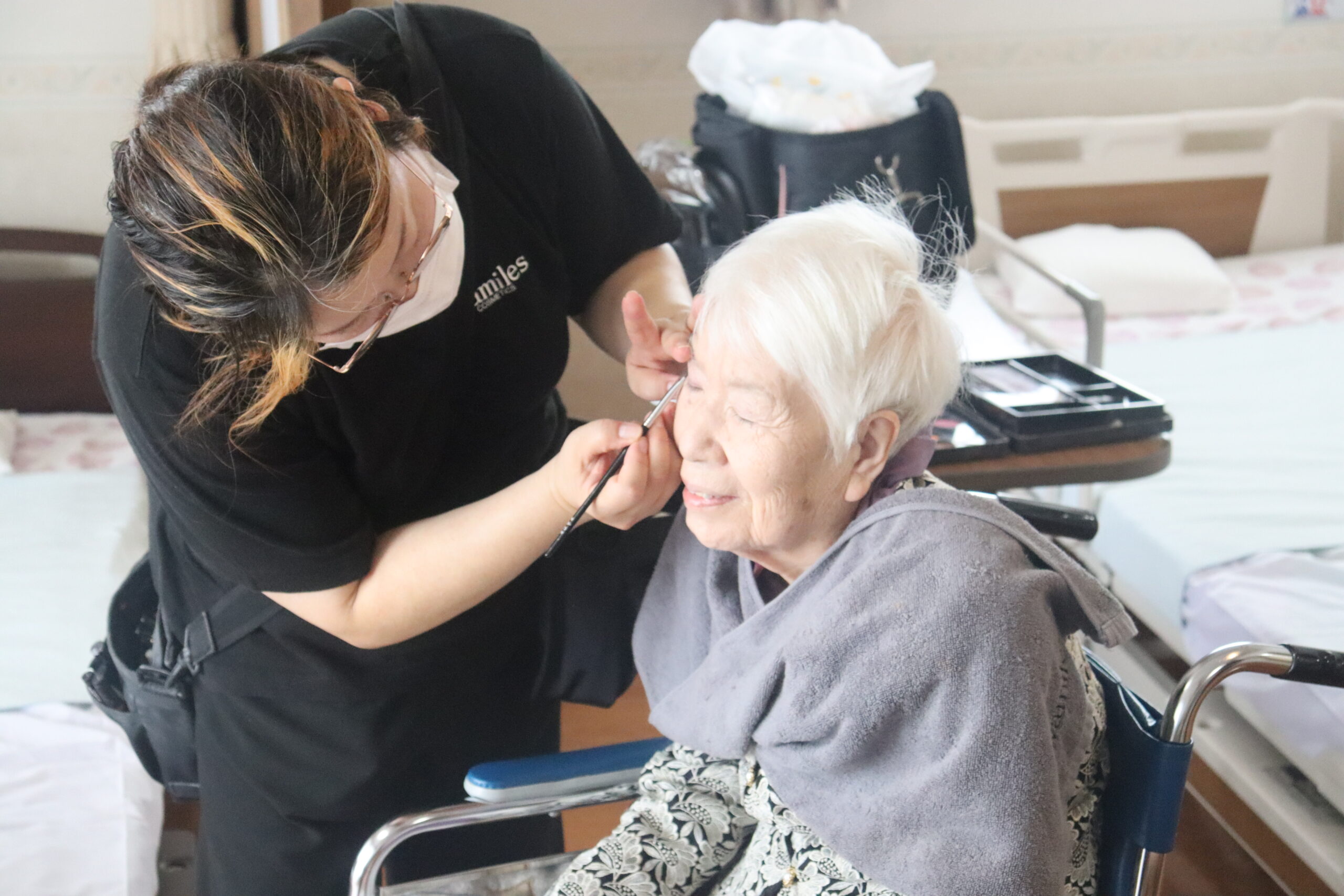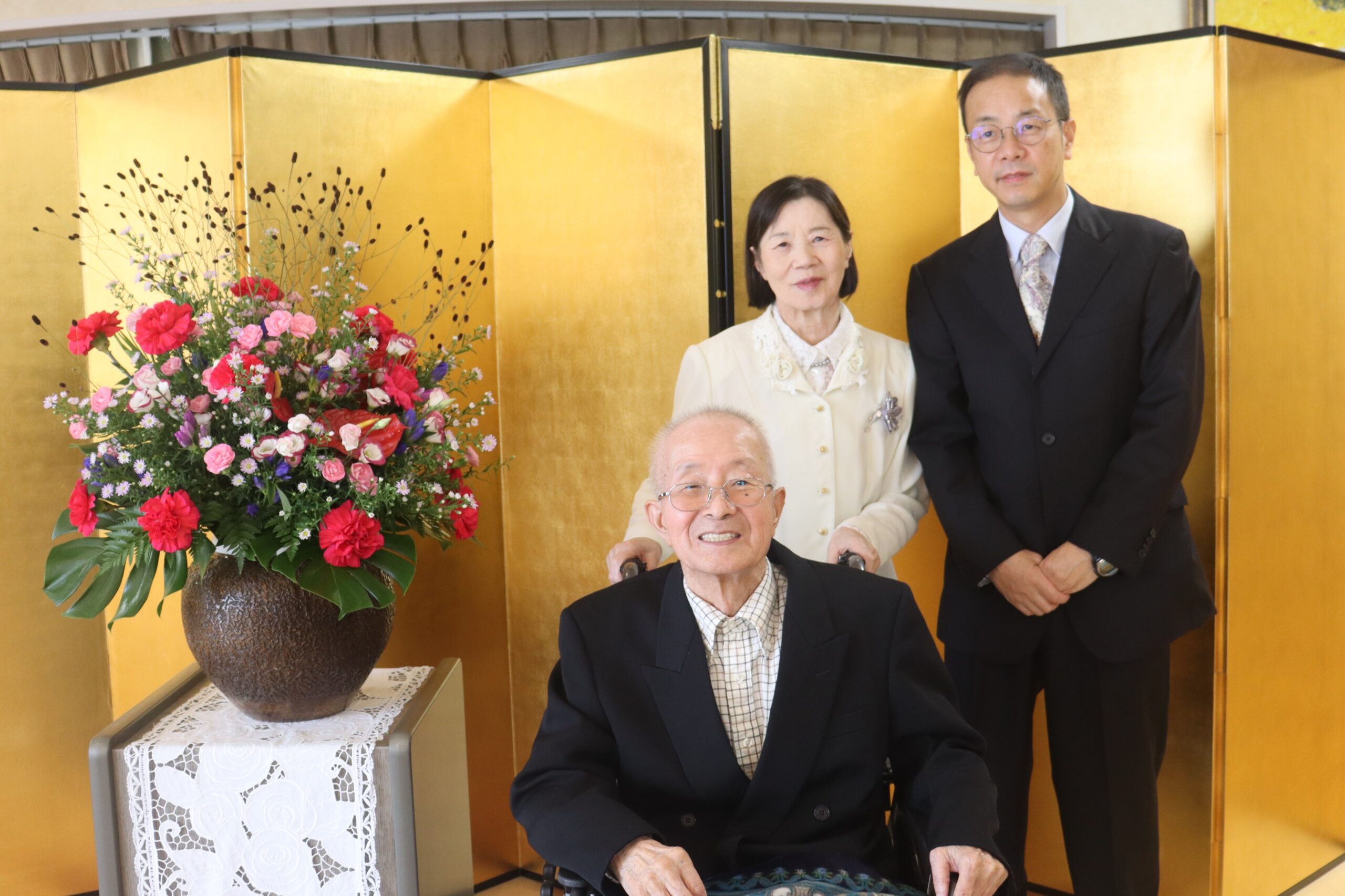 会に先立って、お祝いを受ける方とご家族が一緒に記念写真を撮りました。メイクアップしお洒落をした入所者さんの姿に、驚きと喜びの声をあげるご家族もおいででした。新型コロナウイルス感染症予防のため、今年もご家族の同席は式典のみとしましたが、皆様にも喜んで頂けました。