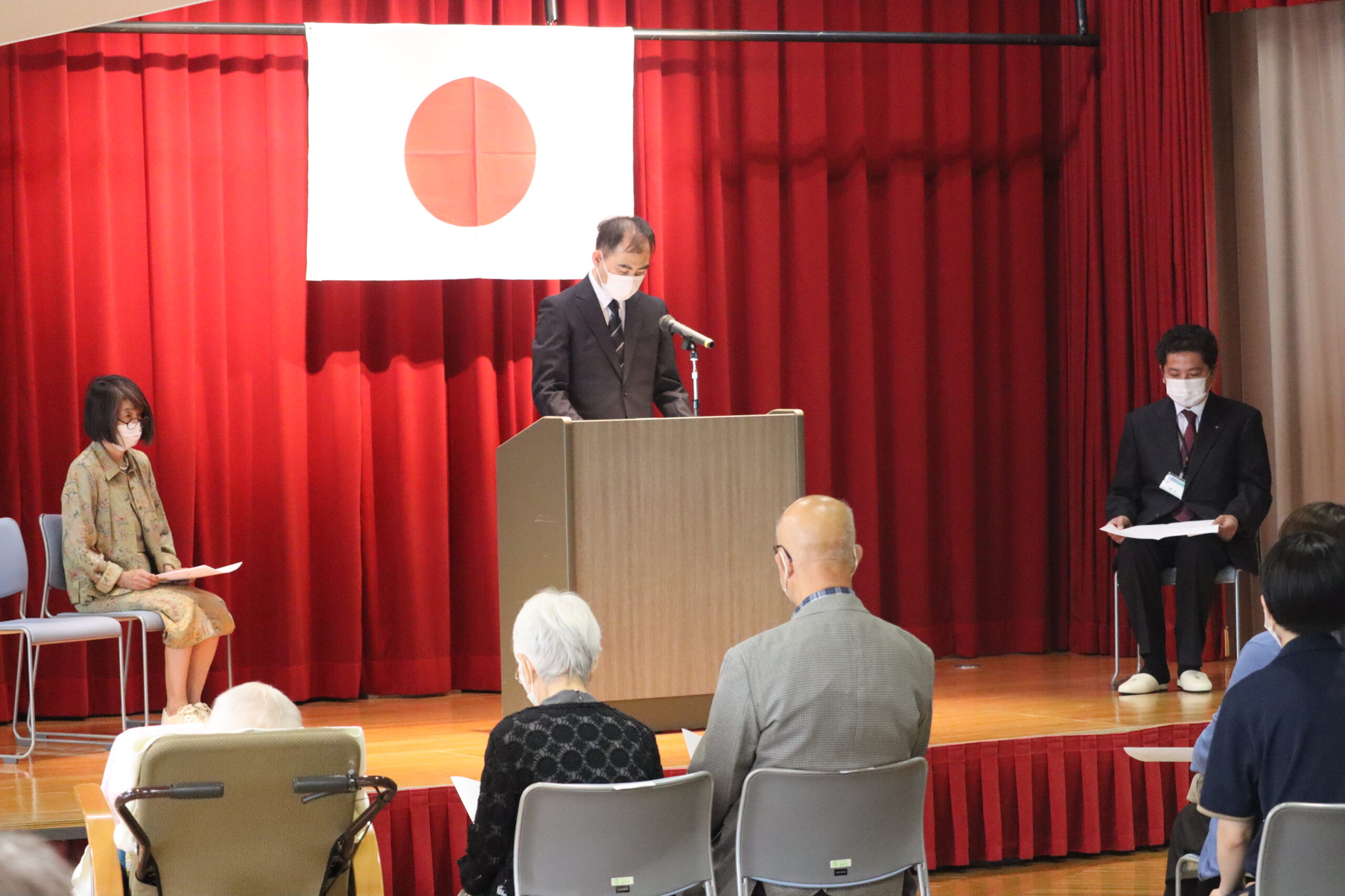 9月12日、老人週間に先がけて令和7年度の福寿荘敬老会を行いました。お祝いの対象者は、上寿(100歳以上)、百歳、白寿(99歳)、米寿、喜寿を迎えた22名の方々でした。百歳の方(5名)には、内閣総理大臣と岩手県知事からの御祝状と記念品が届き、御祝状は施設長が代読してお渡ししました。