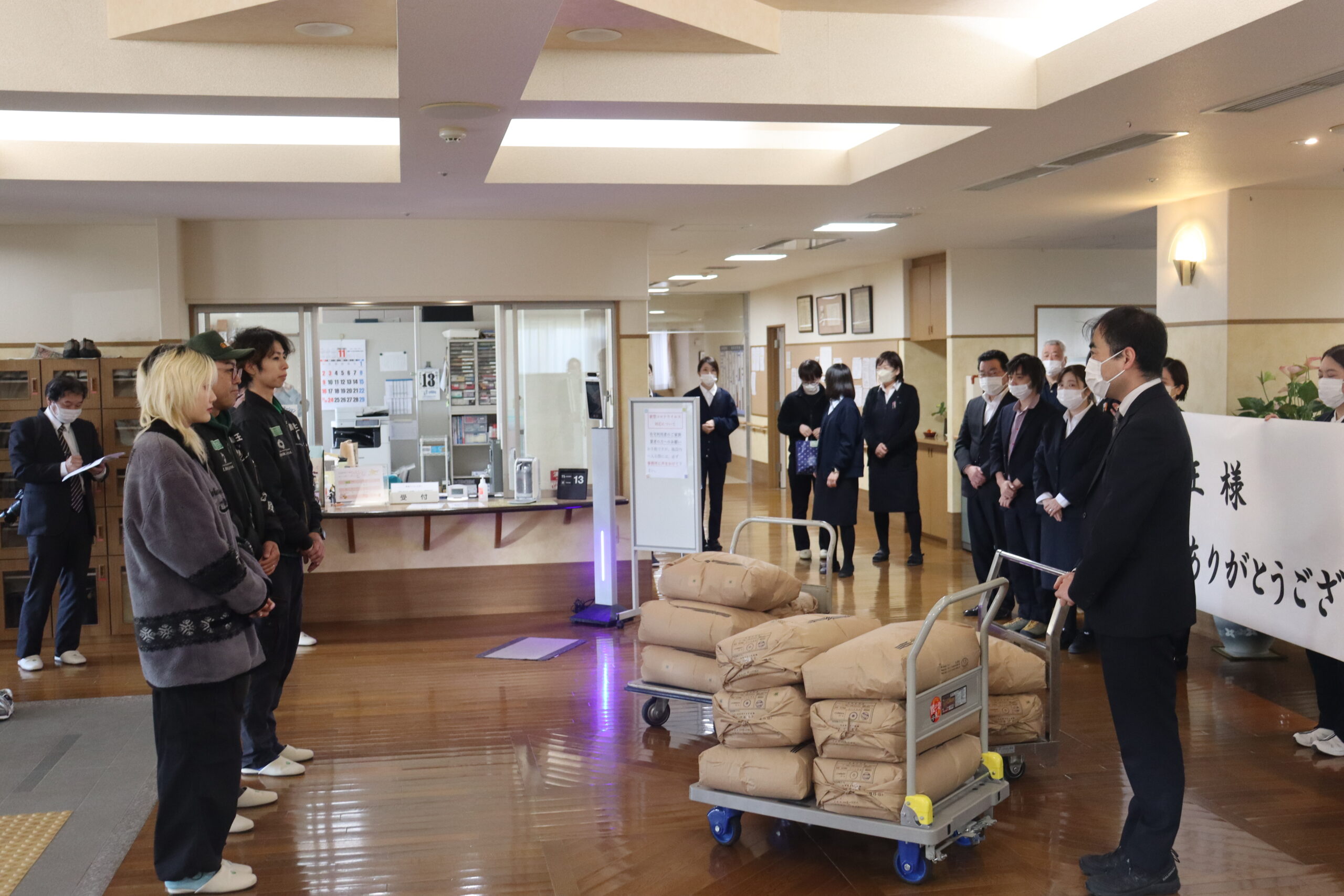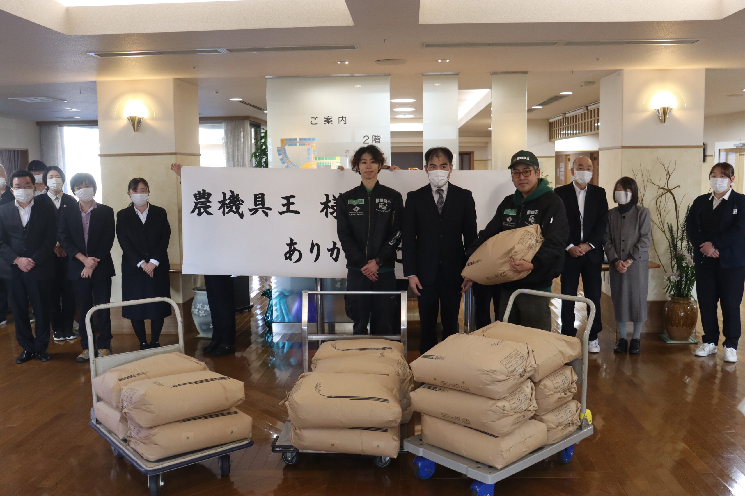 農機具王 岩手店様では、今年初めて地元の田んぼで米作りを始め、「収穫したお米を地元に役立てたい」と、今回の寄付に至ったとのお話でした。福寿荘の小竹施設長は、「昨年末から続く米価格の高騰もあり、新米の季節にこんなに沢山の米を頂けることに心から感謝を申しあげます。入所者さん方にとって、毎日の食事は大きな楽しみの一つです。今回頂戴した新米を早速召しあがって頂き、今後も美味しい給食の提供に努めます」とお礼を述べました。