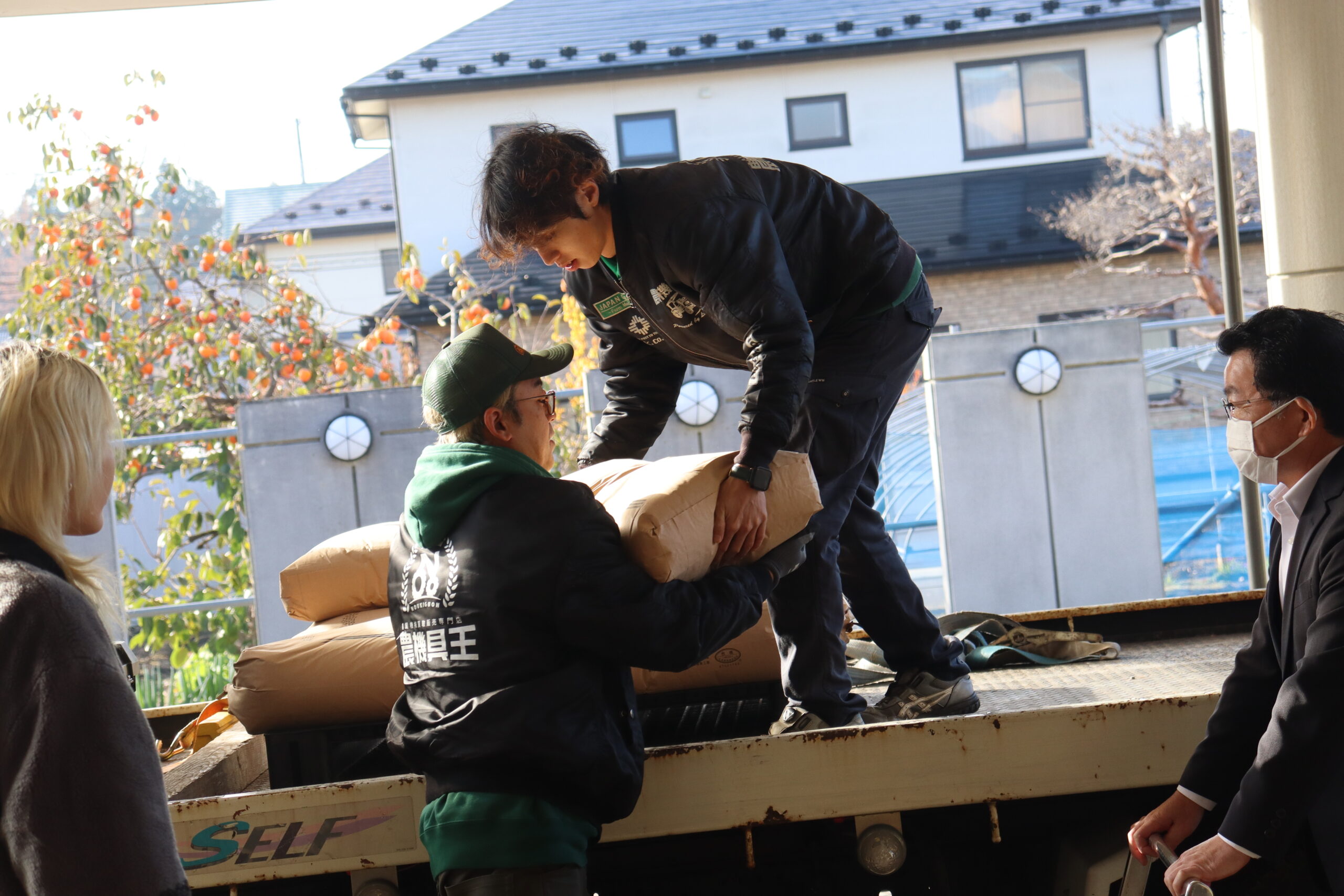 11月13日、株式会社リンクが運営する「農機具王 岩手(奥州前沢)店」様から、新米の『ひとめぼれ』500kgを頂きました。福寿荘職員は玄関に集合し、この望外の贈り物をお礼の垂れ幕と拍手でお迎えしました。トラックから30kg入りの玄米の袋が次々と施設に搬入され、職員一同から喜びの声があがりました。