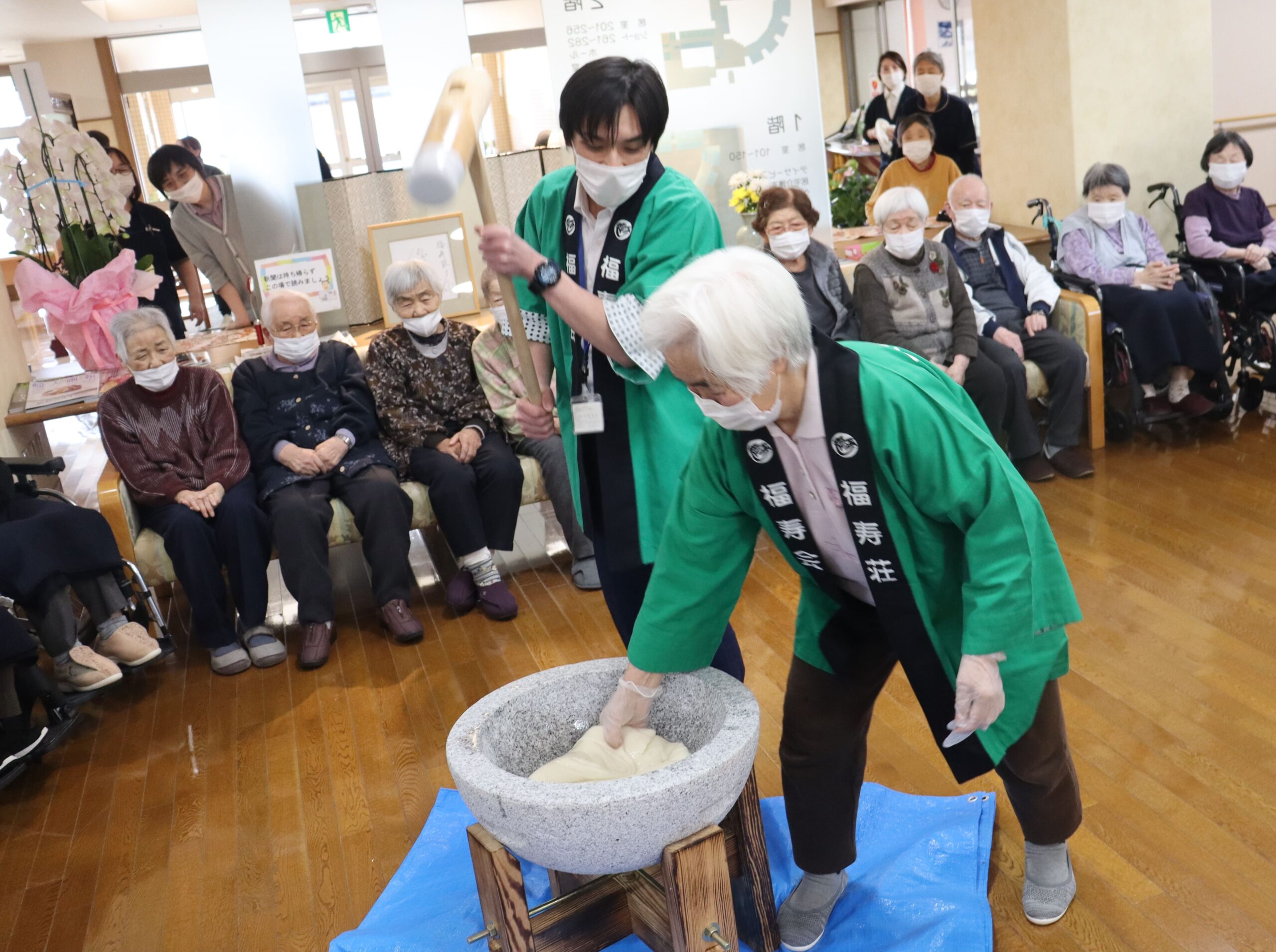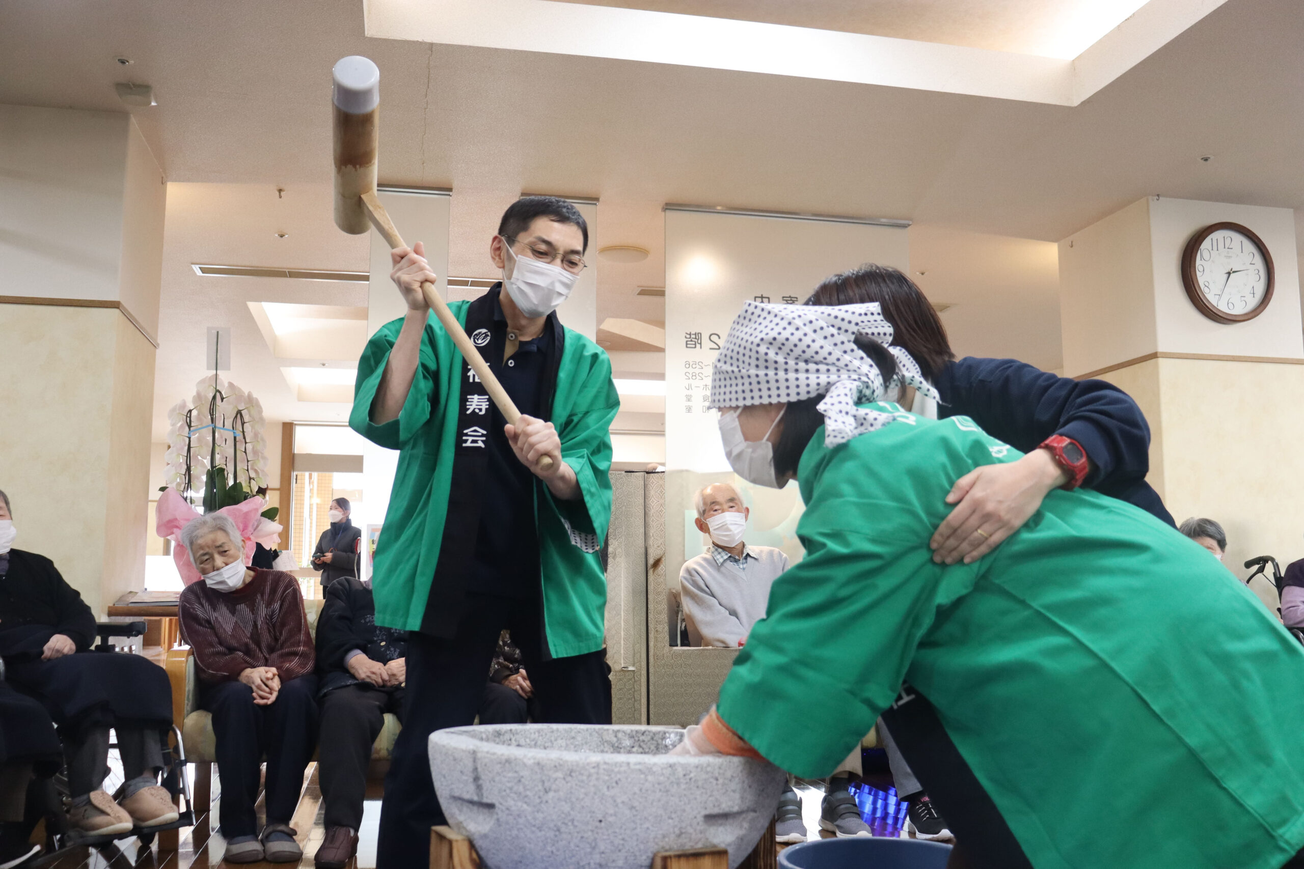 福寿荘 新年はもう間近 餅つき 投稿日:2025年12月29日 12月26日午後、毎年恒例の餅つきを行いました。会場のロビーには、施設入所者とデイサービス利用者、あわせて約50人ほどが集まり、職員が交代で餅をつく姿に歓声があがりました。