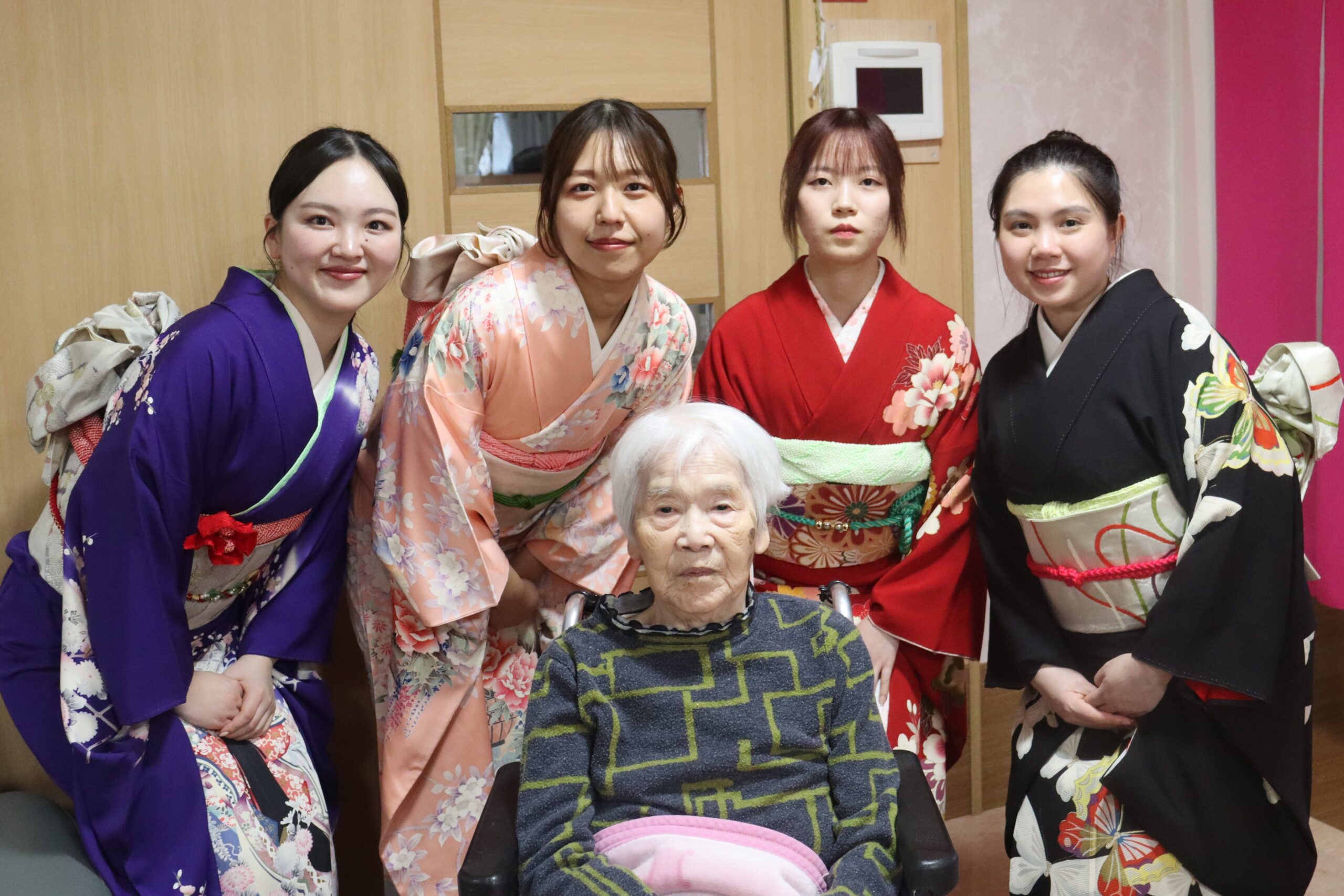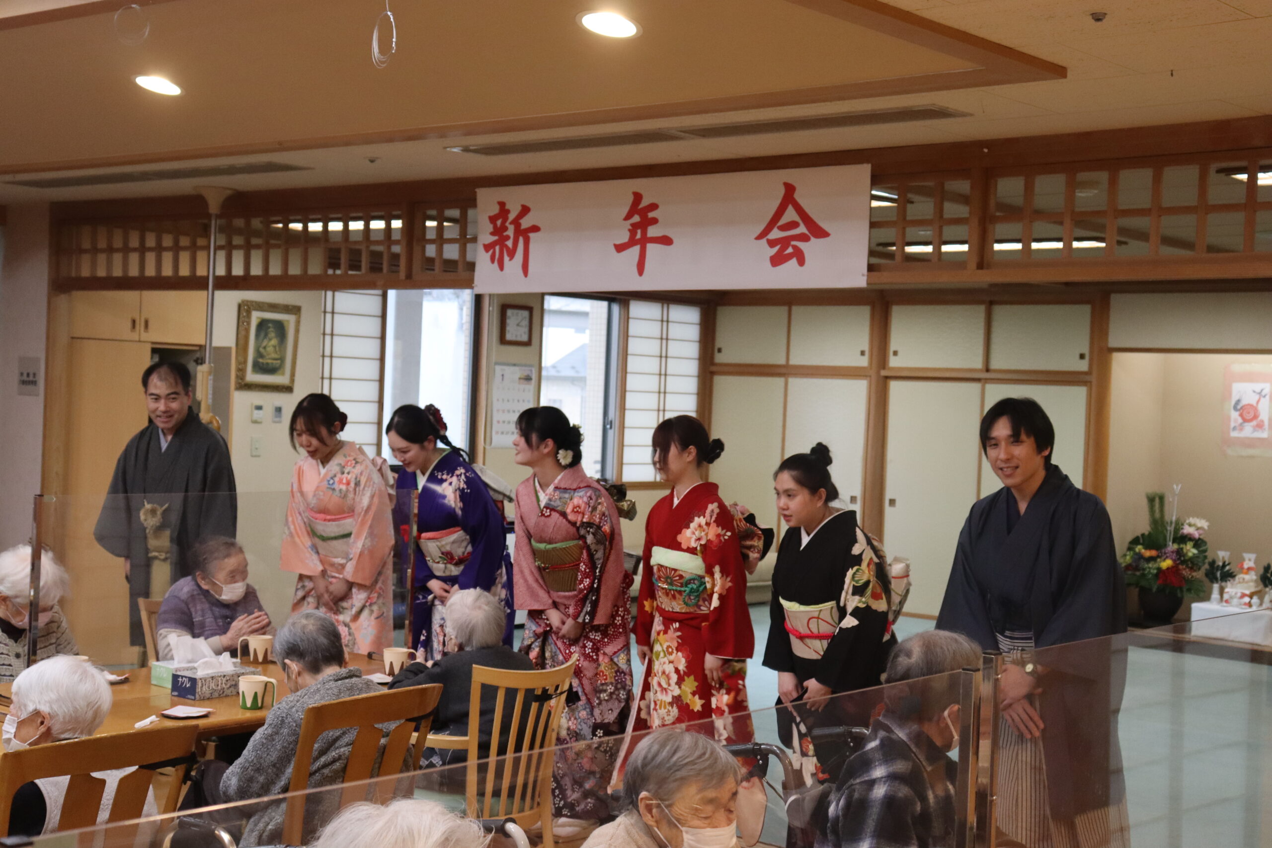 7名は、二階ホールで開かれた「新年茶会」でお抹茶を入所者さんにお出しし、その後は各ブロックを訪問。最後にデイサービスセンターに赴き、利用者さんに年始めのご挨拶をしました。皆さんに大変喜んで頂いた様子で、新年会の準備に奔走した職員も一緒に楽しみました。