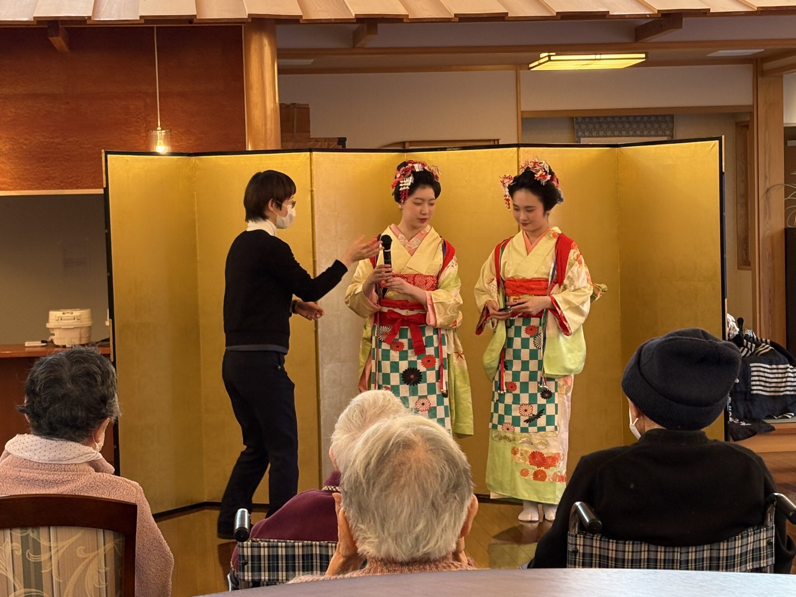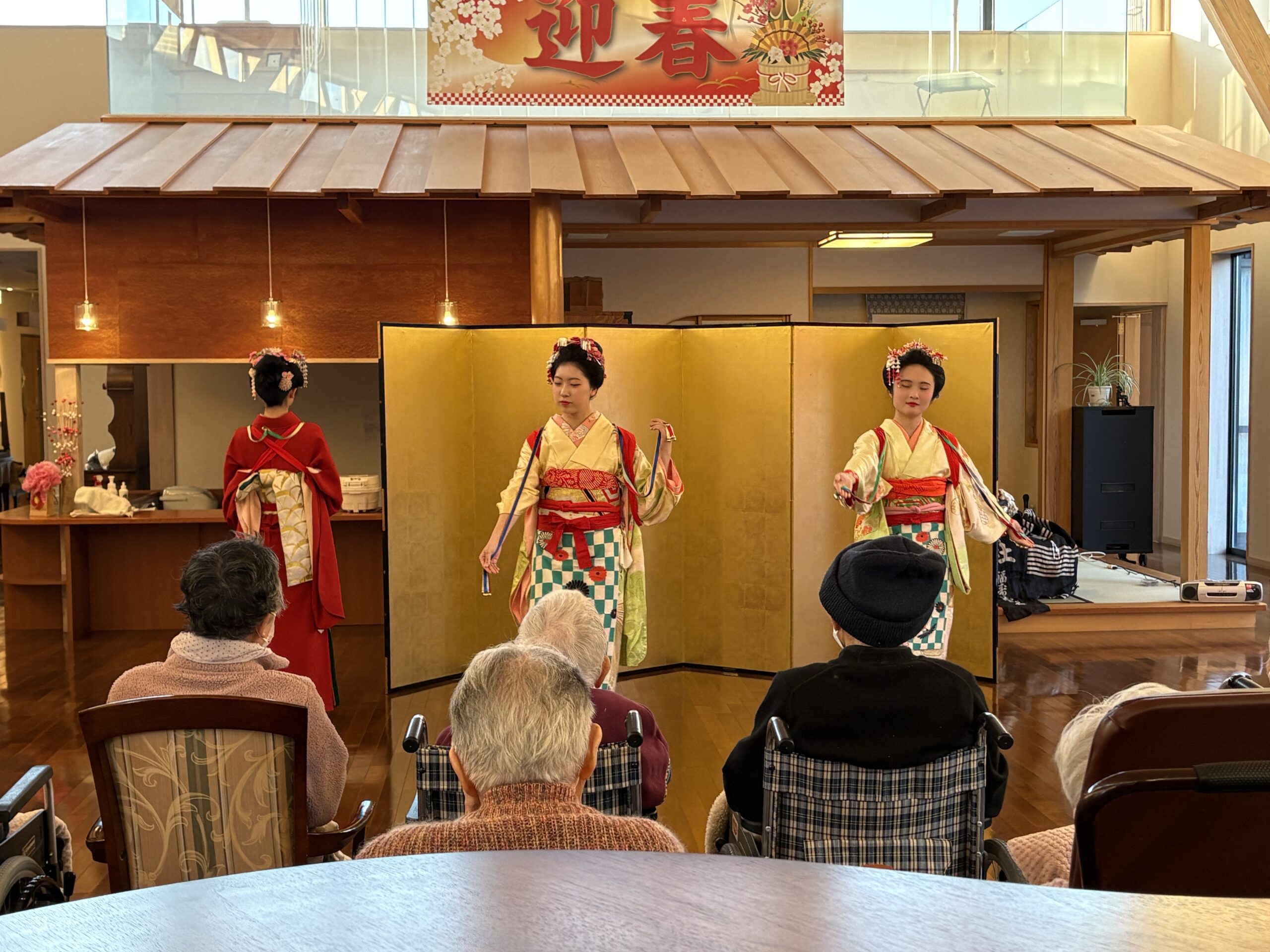 入居者約30名がホールに集まり、「藤娘」「祇園小唄」などの演目を鑑賞。アンコールでは午(うま)年にちなんだ「ちゃぐちゃぐ馬コ」が披露され、なじみのあるメロディに手拍子が湧き、会場はいちだんと盛り上がりました。踊り終えた水高生の皆さんは、「皆さんに楽しんで頂くと同時に、自分たちも踊ることを楽しめた」と安堵の表情で語っていました。