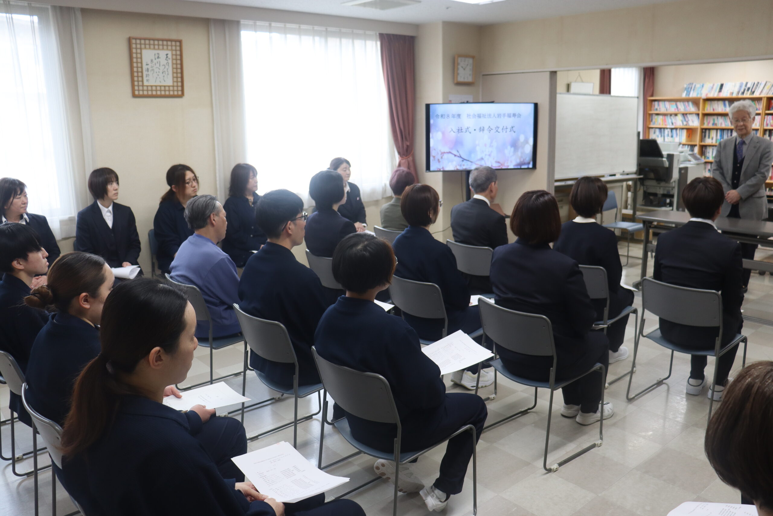 4月1日、辞令交付式が行われました。大きな希望と少しの緊張とともに初出勤の日を迎えた新入職員4名と、昇進・異動対象の職員が辞令を受け取り、芳沢正義理事長・小竹徹施設長の年頭の挨拶を傾聴しました。