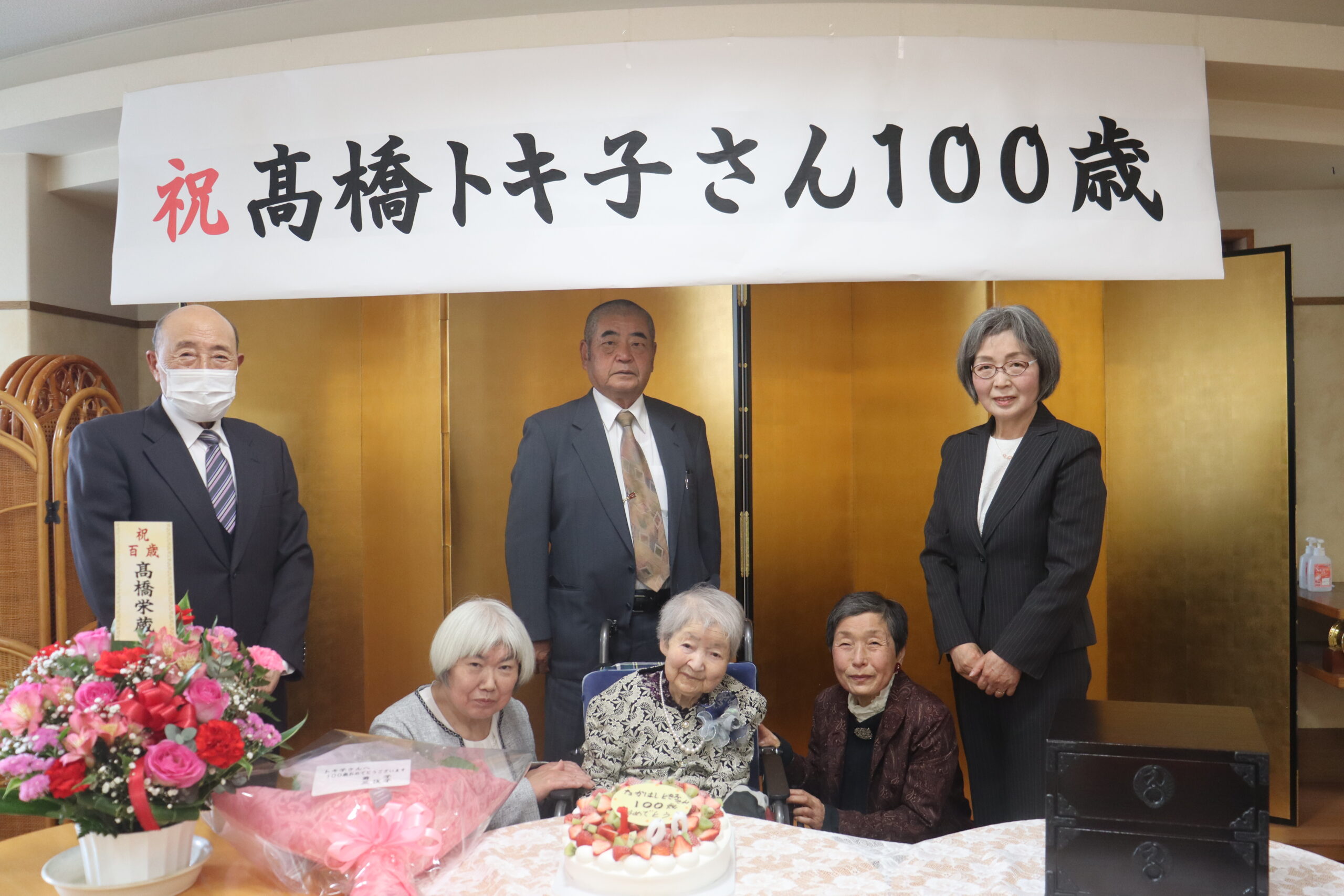 さる3月30日、福寿荘入所者である高橋トキ子さんの、百歳のお祝いの会が開かれました。この日のトキ子さんはご家族が沢山いらしたのが嬉しかったのか、終始目を細めて穏やかな笑顔を浮かべ、とてもご機嫌な様子。施設長によるお祝いの挨拶ののち、記念品の岩谷堂小箪笥を受け取り、ご家族の皆さんと記念撮影をされました。